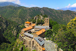 Abtei Saint-Martin-du-Canigou (katalanisch Sant Martín del Canigó) liegt 1094 Meter hoch am Westhang in knapp halber Höhe des 2785 Meter hohen